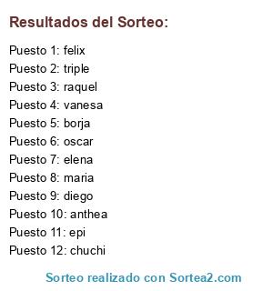 Lista de participantes: diego, borja, oscar, maria, chuchi, elena, vanesa, felix, raquel, epi, anthea, triple.