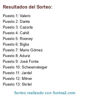 Lista de participantes: Jardel, Biglia, Aduriz, Milner, Skrtel, Valero, Dante, Cazorla, Rooney, Schweinsteiger, José Fonte, Cahill, Mario Gómez.