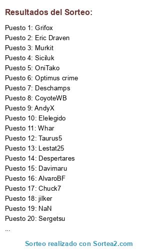 Lista de participantes: Sergetsu, Lestat25, Murkit, Despertares, Chuck7, NaN, Eric Draven, Optimus crime, Davimaru, OniTako, Grifox, AndyX, Gulxes, Whar, CoyoteWB, Siciluk, AlvaroBF, Elelegido, Darkness, Taurus5, Sikus, Deschamps, jilker.