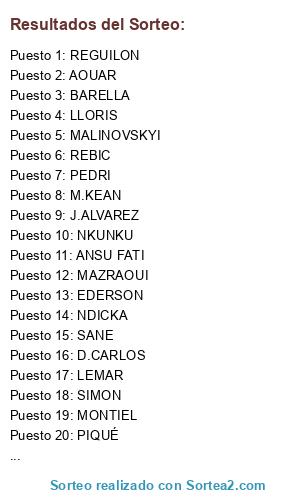 Lista de participantes: EDERSON, LLORIS, D.CARLOS, PIQUÉ, NDICKA, MONTIEL, MAZRAOUI, REGUILON, PEDRI, AOUAR, BARELLA, NKUNKU, LEMAR, SIMON, SANE, ANSU FATI, REBIC, MALINOVSKYI, G.MORENO, J.ALVAREZ, M.KEAN.