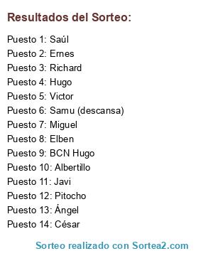Lista de participantes: Victor, Elben, Albertillo, Richard, Miguel, César, Ángel, Pitocho, Javi, BCN Hugo, Saúl, Hugo, Ernes, Samu (descansa).
