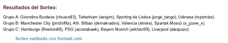 Lista de participantes: PSG (acostabaek), Manchester City (pirichififa), Girondins Burdeos (chusco83), Valencia (etnies), Udinese (mpombix), Ath. Bilbao (demakrados), Hamburgo (Restion88), Spartak Moscú (x_jzone_x), Sporting de Lisboa (jorge_tango), Tottenham (sergim), Bayern Munich (arkhan99), Liverpool (alexpozo).