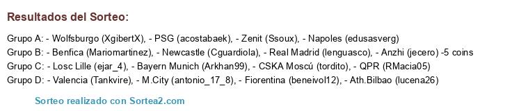 Lista de participantes: - PSG (acostabaek), - QPR (RMacia05), - Bayern Munich (Arkhan99), - Ath.Bilbao (lucena26), - Fiorentina (beneivol12), - Real Madrid (lenguasco), - Losc Lille (ejar_4), - Anzhi (jecero) -5 coins, - Newcastle (Cguardiola), - CSKA Moscú (tordito), - Zenit (Ssoux), - Napoles (edusasverg), - Wolfsburgo (XgibertX), - Benfica (Mariomartinez), - M.City (antonio_17_8), - Valencia (Tankvire).