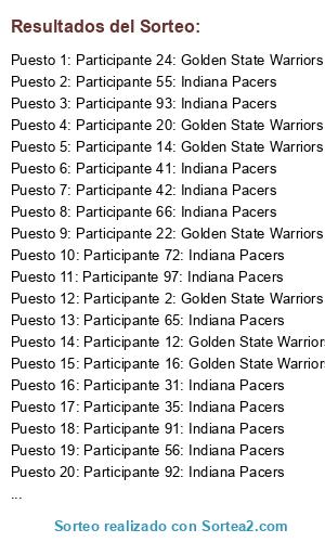 Lista de participantes: Participante 1: Golden State Warriors, Participante 2: Golden State Warriors, Participante 3: Golden State Warriors, Participante 4: Golden State Warriors, Participante 5: Golden State Warriors, Participante 6: Golden State Warriors, Participante 7: Golden State Warriors, Participante 8: Golden State Warriors, Participante 9: Golden State Warriors, Participante 10: Golden State Warriors, Participante 11: Golden State Warriors, Participante 12: Golden State Warriors, Participante 13: Golden State Warriors, Participante 14: Golden State Warriors, Participante 15: Golden State Warriors, Participante 16: Golden State Warriors, Participante 17: Golden State Warriors, Participante 18: Golden State Warriors, Participante 19: Golden State Warriors, Participante 20: Golden State Warriors, Participante 21: Golden State Warriors, Participante 22: Golden State Warriors, Participante 23: Golden State Warriors, Participante 24: Golden State Warriors, Participante 25: Indiana Pacers, Participante 26: Indiana Pacers, Participante 27: Indiana Pacers, Participante 28: Indiana Pacers, Participante 29: Indiana Pacers, Participante 30: Indiana Pacers, Participante 31: Indiana Pacers, Participante 32: Indiana Pacers, Participante 33: Indiana Pacers, Participante 34: Indiana Pacers, Participante 35: Indiana Pacers, Participante 36: Indiana Pacers, Participante 37: Indiana Pacers, Participante 38: Indiana Pacers, Participante 39: Indiana Pacers, Participante 40: Indiana Pacers, Participante 41: Indiana Pacers, Participante 42: Indiana Pacers, Participante 43: Indiana Pacers, Participante 44: Indiana Pacers, Participante 45: Indiana Pacers, Participante 46: Indiana Pacers, Participante 47: Indiana Pacers, Participante 48: Indiana Pacers, Participante 49: Indiana Pacers, Participante 50: Indiana Pacers, Participante 51: Indiana Pacers, Participante 52: Indiana Pacers, Participante 53: Indiana Pacers, Participante 54: Indiana Pacers, Participante 55: Indiana Pacers, Participante 56: Indiana Pacers, Participante 57: Indiana Pacers, Participante 58: Indiana Pacers, Participante 59: Indiana Pacers, Participante 60: Indiana Pacers, Participante 61: Indiana Pacers, Participante 62: Indiana Pacers, Participante 63: Indiana Pacers, Participante 64: Indiana Pacers, Participante 65: Indiana Pacers, Participante 66: Indiana Pacers, Participante 67: Indiana Pacers, Participante 68: Indiana Pacers, Participante 69: Indiana Pacers, Participante 70: Indiana Pacers, Participante 71: Indiana Pacers, Participante 72: Indiana Pacers, Participante 73: Indiana Pacers, Participante 74: Indiana Pacers, Participante 75: Indiana Pacers, Participante 76: Indiana Pacers, Participante 77: Indiana Pacers, Participante 78: Indiana Pacers, Participante 79: Indiana Pacers, Participante 80: Indiana Pacers, Participante 81: Indiana Pacers, Participante 82: Indiana Pacers, Participante 83: Indiana Pacers, Participante 84: Indiana Pacers, Participante 85: Indiana Pacers, Participante 86: Indiana Pacers, Participante 87: Indiana Pacers, Participante 88: Indiana Pacers, Participante 89: Indiana Pacers, Participante 90: Indiana Pacers, Participante 91: Indiana Pacers, Participante 92: Indiana Pacers, Participante 93: Indiana Pacers, Participante 94: Indiana Pacers, Participante 95: Indiana Pacers, Participante 96: Indiana Pacers, Participante 97: Indiana Pacers, Participante 98: Indiana Pacers, Participante 99: Indiana Pacers, Participante 100: Indiana Pacers.