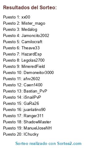 Lista de participantes: Anseco, bananton1, MrStride123, XxiagoxXPvP, miic2223, byluiscraft13, Bastian_PvP, Attus, galaxypotato2014, diamond_man_, ThePro8000XDD, McTristanPvP, GabboBreaker, ZeusMC_PVP, Ariloco, Pbbvideos, xZarken, Sasuke2012s, Legolas2700, El_Duro123, GaRa26, DAVI1402, TheVineMC, xShiny__, Caen1400, Nayecraft, MineredField, Demoneitor3000, xNoise , xLlamaSx, MiguelcoolHD, LaikanGaymer, juanlatino90, iMemo02_, Carlostumminaro, carloselnoob78, Camilocraft, abdiel123, TheHiceaFreak, alcides321, donovascraft, gokugamer7, frankinto, Calico555, xXPastoXx, DeadKiiller, igotswah917, EnderGame89_xD, saunfubukiX, TheXMenPRO, xGhostPvP, TheNakro, DiegoFire, ENTOMOS, ShadowMaster, ArturoL2001, OhSnyk, CARLOSCCF999, iSnailPvP, jjalonsovi, JYBIOS, HazardEsp, max008, IChucky, Theave33, _BastorHD_, Medalog, LCZiggy, angel0213721, Carlos13436, Alexluna, eskil24, CacoGamer2003, Jokerblc, afvv2602, TheDenisMC_, madokk112xD, ManuelJoseNH, Leolion8, TheBalamPvP, lEncore, XPROKILLER30, Ranger311, Jamoncito2002, Pipo2002, Vyntra, GTDanielGT, Lactertheboss, Edu_918, ByUuri, Slashercraft, Fackah, Francisco_72, Mister_mago, DeathLife, Rabe, ElJerryMC, xx00, SEBA3256, .