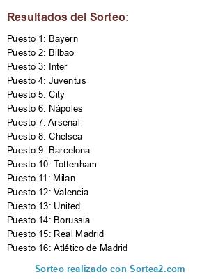 Lista de participantes: Barcelona, Real Madrid, Bayern, Manchester United, Borussia Dortmund, Manchester City, Tottenham, Arsenal, Bilbao, Juventus, Inter de Milan, Milan, Nápoles, Atlético de Madrid, Chelsea, Valencia.