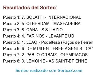 Lista de participantes: 1. LEÃO - Podefteza (Paços de Ferreira), 2. PABLO ORBAIZ - OLYMPIACOS, 3. LEMOINE - AS SAINT-ETIENNE, 4. FARINOS - LEVANTE UD, 5. OLBERDAM - MASEADEIRA, 6. DE MUILEN - FREE AGENTS - CANADA, 7. BOLATTI - INTERNACIONAL, 8. CANA - S.S. LAZIO.