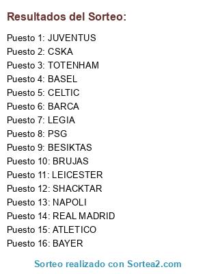 Lista de participantes: PSG, BASEL, NAPOLI, BESIKTAS, BARCA, CELTIC, BAYER, ATLETICO, REAL MADRID, LEGIA, BRUJAS, SHACKTAR, JUVENTUS, LEICESTER, CSKA, TOTENHAM.