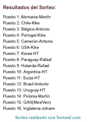 Lista de participantes: Chile-Kike, Camerún-Antonio, Bélgica-Antonio, GAN(Mex/Ven), Uruguay-HT, Brasil-Antonio, Alemania-Martín, Inglaterra-Johann, Polonia-Martín, Paraguay-Rafael, Portugal-Kike, USA-Kike, Argentina-HT, Holanda-Rafael, Korea-HT, Suiza-HT.