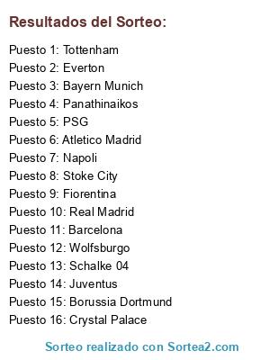 Lista de participantes: Atletico Madrid, Barcelona, Bayern Munich, Borussia Dortmund, Crystal Palace, Everton, Fiorentina, Juventus, Napoli, Panathinaikos, PSG, Real Madrid, Schalke 04, Stoke City, Tottenham, Wolfsburgo.