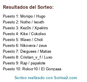 Lista de participantes: Notho / leoxth, Rap / papalote, Monipo / Hugo, Kez0n / Xpektro, Kike / Cokoliso, Wawo / Choli, Cristian_v_f / Luxo, Dieguees / Matias, Nikovera / zeus, Rolocr10 / El Gonzaaa.