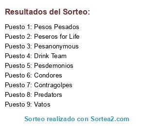 Lista de participantes: Vatos, Pesos Pesados, Pesdemonios, Contragolpes, Peseros for Life, Condores, Predators, Pesanonymous, Drink Team.