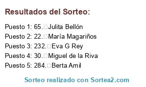 Lista de participantes: , 1. Jorge Gallego , 2. Ines Guisado , 3. Heliodoro Ga , 4. Iluminada Alarcón , 5. Marcos Cordeiro Paredes , 6. Natalia Garch , 7. Teresa Garcia Alonso , 8. Blanca GD , 9. Núria Granados , 10. Eva Durhan , 11. Luli España , 12. Albert Ruiz , 13. Berta Amil , 14. Montserrat Diaz Ramón , 15. Jaime Molina , 16. Ele Granados Prieto , 17. Vanesa Pachon Diaz , 18. Carmen Cano Molinero , 19. Rosa Vg , 20. Patri Goruz , 21. Manu Gould , 22. María Magariños , 23. Conchi Garcia Nieto , 24. Jose Manuel Moreno , 25. Almudena Bermudez Benitez , 26. Jose Antonio Blanco , 27. Patty Martínez Cayuela , 28. Laura Redondo Lopez , 29. Josefa Pereira Cordero , 30. Miguel de la Riva , 31. Stefania Serra , 32. Ana Belén Moreno , 33. Ro Mi , 34. Campanilla Palor , 35. Inma Leonardo , 36. Oletky Aparicio , 37. Gloria Urquidi , 38. Lucia Suarez , 39. Montserrat Lopez Alvarez , 40. Mercedes Peña , 41. Anina Santiago , 42. Mar Martinez Valladares , 43. Virginia López Zatón , 44. Evy Evy , 45. Angeles Diaz Baena , 46. Joaquin Barón Bernat , 47. Luis Espada , 48. Rafa Valera , 49. Berta Amil , 50. Julita Bellón , 51. Julita Bellón , 52. Tatiana RM , 53. Man Mam , 54. Tika Rosa , 55. Pilar Aranda , 56. Victor M. Rubio , 57. Vanesa Perez Pelegrin , 58. Emi De Lucas , 59. Monica Cabral , 60. Isi Bosch Navas , 61. Marisa Perez Gonzalez , 62. Noelia MarCa , 63. Carmen Abril , 64. Julian Alvarez Cabrera , 65. Julita Bellón , 66. IngridyJose Peregrina Zafra , 67. Julita Bellón , 68. Julita Bellón , 69. Andrea Oggiano , 70. Eva Alcázar Salas , 71. Noelia Barro Bellón , 72. Iago Fernández Traba , 73. Pepita Pita , 74. Maika Santiago Lorenzo , 75. Sandra Orgaz , 76. Maria Jose Molina Reina , 77. Fernando Segarra Taus , 78. Juan Muñoz , 79. Beni Bravo , 80. Amparo López del Olmo , 81. Carmen Carcaño , 82. Veronica Ripoll Valiente , 83. Luzdivina Arguelles Vega , 84. Lucia CA , 85. Isa Maqueira , 86. Angel Ruiz , 87. Juan Rodriguez , 88. Antonia Alvarez , 89. Thaoma Bx , 90. Aurora Aida Goas Castro , 91. Consuelo Vera , 92. MiguelAngel González , 93. Alba Caro Diaz , 94. Aroa Sanchez , 95. Manuel Ruiz Rosa , 96. Ricardo Rosario , 97. Leticia Cayon Arranz , 98. Eva AG , 99. Sara Oliette , 100. Lola Esteban , 101. Susana Isabel Sanchez , 102. Ana María De Fuentes , 103. Mercedes Gonzalez Lima , 104. Maty Arma , 105. Ana Belen Franco Martinez , 106. Olga San , 107. Jesus de Juan , 108. Juan Ignacio Ponce , 109. Marino Sanchez Dlm Rodriguez , 110. María Amparo Moreno Carranque , 111. Teresa Benavides Arias , 112. Almudena Perez Calvillo , 113. Ramon Rodriguez , 114. Vanessa Fernández Carballo , 115. Mónica Delgado Fernández , 116. Laura Espada Vera , 117. Mari Carmen Castellanos Caballero Castellanos , 118. Sole Perez , 119. Judith Pérez Diaz , 120. Florentina Orviz , 121. Rocío HF , 122. Reyes Mariscal Blanco , 123. Saray Blazquez Campos , 124. Juan Carlos Lozano Moreno , 125. Pedro Botero , 126. Maja Caral , 127. Alberto Vidal , 128. Javier Martinez , 129. Ana M Fernández , 130. Leyre Fernández , 131. Antonia Muñoz , 132. Jairo Miguel del Río , 133. MaBel AlGa , 134. Francis Velasco , 135. Esther Corchete , 136. Paulina Maria , 137. Rayden Mart , 138. Mito Ranz , 139. Joana JurMa , 140. Marta Ruiz , 141. Jesús Martin Gonzalez , 142. Juanka Rodriguez , 143. Ana Maria CH , 144. Rocio Leiva Bernal , 145. Ana Maria Castillo Pedrosa , 146. Emily Raymon , 147. Rmaria Camacho , 148. Jose Luis Martin , 149. Lucia Ruiz Trujillo , 150. Juan Lax , 151. Lú Asul , 152. Susana Fuertes Yuguero , 153. Nica HerPer , 154. Jon Martinez , 155. Sixto Garcia , 156. Tatiana Cabado Lopez , 157. Maria Saiz , 158. Mariangeles Sales Perales , 159. Eva Ramos , 160. Pura Gonzalez Rodriguez , 161. Ruben Del Valle Valle , 162. Antonia Jimenez , 163. Charo Alcolea , 164. Josefa Lucas , 165. Miguel A Aroca , 166. Paula Lago Pereira , 167. Silvia Calzada , 168. Rosi ML , 169. Enrique Rodriguez , 170. Esther Rodriguez Reche , 171. Vanessa Ogea Navarro , 172. Javier Jb Julian De Blas , 173. Natalia Mas , 174. Elda Dellavalle Pera , 175. Vanesaa Rubio , 176. Cristina Canals , 177. Maria Josefa Perez , 178. Ines Gutierrez Azuar , 179. Nuri Antón Bravo , 180. Elena Coello Lopez , 181. Itziar Arrausi , 182. Yolanda Bauti , 183. Nadesh Inha , 184. Luz Garrido , 185. Sonia Garcia Pastor , 186. Alberto Bayón Fernández , 187. Marilo Lombardia Melendez , 188. Irene Francisca Canudo Cervero , 189. Maria Del Cristo BGarcia , 190. Isabel Garrido Terol , 191. Rocio Garcia Escu , 192. Jose Ruiz , 193. Laurindinha Peres , 194. Rodrigo Dominguez , 195. Barti López Calado , 196. M Josefa Criado Azor , 197. Mayte Garla , 198. Maria Benita Gomez Barreira , 199. Ignacio S Garrido , 200. Andrés Caro , 201. Adriana Calderon Martin , 202. Jesus Sanchis Gaspar , 203. Mar Uroz Guerrero , 204. Aitor Arana , 205. Maria Jesus Camara Montelio , 206. Car Mt Rm , 207. Eva Ricitos , 208. Menchu Pinpon , 209. Charito Lopez Garcia , 210. Sandra Gomez , 211. Mabel Martin Gragera , 212. ALe ALita , 213. Juana Mari Ruvabirela , 214. Celia Navarro Nuñez , 215. Cristina Hernandez , 216. Vanessa SH , 217. Paula Rodrigo , 218. Pilar Cabré Rubio , 219. Luz Garcia Castiñeira , 220. Criss Garrido Romera , 221. Manu Figueredo , 222. Iker Madariaga Bilbao , 223. Purificación Gil Berdejo , 224. Natalia Gil Valcarcel , 225. Jordi GA , 226. Francisco Garcia Llamas , 227. Andrea Silvina Gomez Vilches , 228. Cati Garcia , 229. Susana Parguiña , 230. Mari Munin , 231. Marta Balbuena Barral , 232. Eva G Rey , 233. María Magdalena Osma Bosch , 234. Leandro Valverde , 235. Toñi Laserna Sauce , 236. Ana Alonso Coello , 237. Eduardo A Mazaroca , 238. Sonia Sanchez , 239. Susana Barea , 240. Rosita Rosa Rosilla , 241. Asuncion Navarro , 242. Maria Jose Rosello , 243. Marcela Ulehla Mrazova , 244. Sergio Arnaiz Delgado , 245. Vic Manuel Herndz , 246. Javier Beltran Carceller , 247. Pilar García Sánchez , 248. Llanos Espinosa , 249. Jose Antonio Rodri