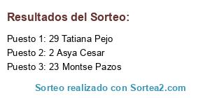 Lista de participantes: 1 Enma Martinez, 2 Asya Cesar, 3 Belén Arias, 4 Enma Quiroga, 5 David Carracedo, 6 Cucadas en la red, 7 Marta Sande, 8 M. del Valle, 9 Sandra López, 10 Genma Montes, 11 Rosa Fernández, 12 Ana Isabel Pérez, 13 Sandra Souto, 14 Esther Rosende, 15 Pilar pilipez, 16 Ursula urp, 17Carmen Evoluciona, 18 Raquel Romay, 19 Lupe Domínguez, 20 Eli Ayuso, 21 Ana Escrigas, 22 Naza Hermida, 23 Montse Pazos, 24 Lucía Barral, 25 Arantxa Vazquez, 26 Marta Sánchez, 27 Maite Martínez, 28 TBI, 29 Tatiana Pejo, 30 Celia Martínez, 31 Carmen Hermida, 32 Patri Mora, 33 María Basoa, 34 Jessica Alvarez.