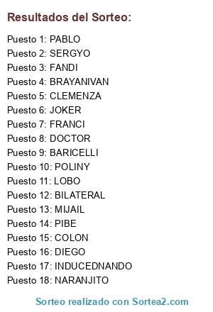 Lista de participantes: BARICELLI, INDUCEDNANDO, LOBO, POLINY, PABLO, NARANJITO, COLON, DOCTOR, BILATERAL, SERGYO, BRAYANIVAN, CLEMENZA, DIEGO, JOKER, MIJAIL, FRANCI, FANDI, PIBE.