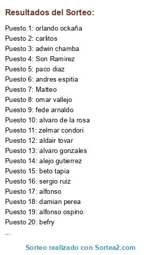 Lista de participantes: Matteo, Son Ramirez, sergio ruiz, rafael vergara, stiven licona, alejo gutierrez, carlitos, befry, alfonso, fede arnaldo, adwin chamba, real cartagena, andres espitia, alvaro de la rosa, mauricio pinilla, zelmar condori, beto tapia, orlando ockaña, alvaro gonzales, damian perea, aldair tovar, paco diaz, claudio medel, omar vallejo, alfonso ospino.