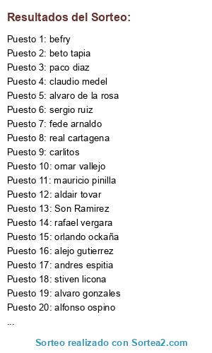 Lista de participantes: Matteo, Son Ramirez, sergio ruiz, rafael vergara, stiven licona, alejo gutierrez, carlitos, befry, alfonso, fede arnaldo, adwin chamba, real cartagena, andres espitia, alvaro de la rosa, mauricio pinilla, zelmar condori, beto tapia, orlando ockaña, alvaro gonzales, damian perea, aldair tovar, paco diaz, claudio medel, omar vallejo, alfonso ospino.