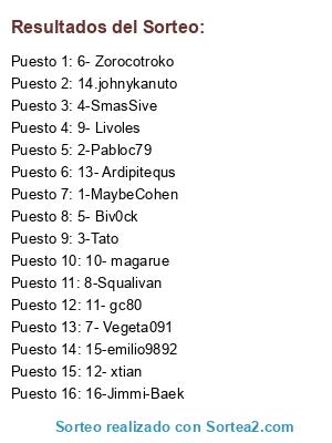 Lista de participantes: 1-MaybeCohen, 2-Pabloc79, 3-Tato, 4-SmasSive, 5- Biv0ck, 6- Zorocotroko, 7- Vegeta091, 8-Squalivan, 9- Livoles, 10- magarue, 11- gc80, 12- xtian, 13- Ardipitequs, 14.johnykanuto, 15-emilio9892, 16-Jimmi-Baek.