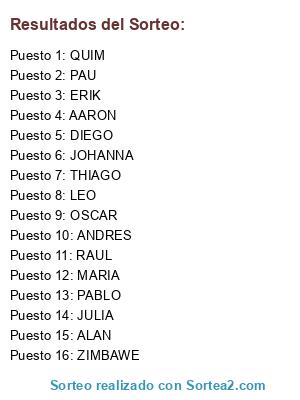 Lista de participantes: QUIM, LEO, ZIMBAWE, JOHANNA, PAU, JULIA, ERIK, DIEGO, PABLO, OSCAR, ALAN, AARON, MARIA, RAUL, THIAGO, ANDRES.