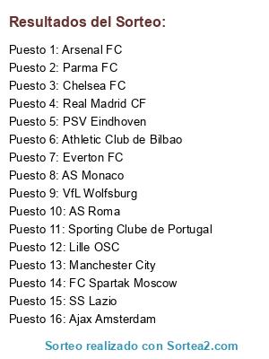 Lista de participantes: Everton FC, Ajax Amsterdam, FC Spartak Moscow, SS Lazio, Arsenal FC, Sporting Clube de Portugal, AS Monaco, Lille OSC, Real Madrid CF, Manchester City, AS Roma, Athletic Club de Bilbao, PSV Eindhoven, VfL Wolfsburg, Parma FC, Chelsea FC.