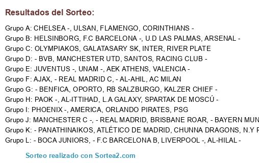 Lista de participantes: VALENCIA -, ORLANDO PIRATES, ARSENAL -, ATLÉTICO DE MADRID, RACING CLUB -, OLYMPIAKOS, PHOENIX -, SANTOS, LIVERPOOL -, INTER, PAOK -, AEK ATHENS, GALATASARY SK, - REAL MADRID, KALZER CHIEF -, L.A GALAXY, CORINTHIANS -, MANCHESTER UTD, UNAM -, AC MILAN, JUVENTUS -, AL-ITTIHAD, CHELSEA -, HELSINBORG, MANCHESTER C -, OPORTO, BRISBANE ROAR, - F.C BARCELONA B, U.D LAS PALMAS, - BENFICA, N.Y RED BULLS, - BAYERN MUNCHEN, ULSAN, - BVB, RB SALZBURGO, - REAL MADRID C, AJAX, - BOCA JUNIORS, SPARTAK DE MOSCÚ -, AMERICA, F.C BARCELONA -, PSG, AL-HILAL -, RIVER PLATE, CHUNNA DRAGONS, - AL-AHIL, FLAMENGO, - PANATHINAIKOS.
