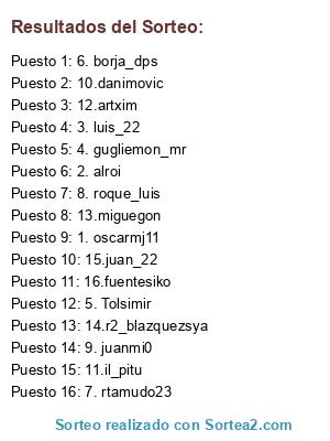 Lista de participantes: 1. oscarmj11, 2. alroi, 3. luis_22, 4. gugliemon_mr, 5. Tolsimir, 6. borja_dps, 7. rtamudo23, 8. roque_luis, 9. juanmi0, 10.danimovic, 11.il_pitu, 12.artxim, 13.miguegon, 14.r2_blazquezsya , 15.juan_22 , 16.fuentesiko.