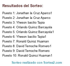Lista de participantes: Yheson bacilio Tapia, Yheson bacilio Tapia1, David Temoche Romero, David Temoche Romero1, Jonathan la Cruz Aparco, Jonathan la Cruz Aparco1, Orlando Quiroz Barcayola, Orlando Quiroz Barcayola1, Ronald Quiroz Huaman, Ronald Quiroz Huaman1.