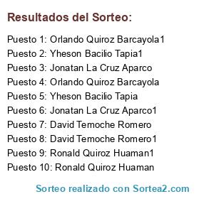 Lista de participantes: Yheson Bacilio Tapia, Yheson Bacilio Tapia1, Jonatan La Cruz Aparco, Jonatan La Cruz Aparco1, Orlando Quiroz Barcayola, Orlando Quiroz Barcayola1, Ronald Quiroz Huaman, Ronald Quiroz Huaman1, David Temoche Romero, David Temoche Romero1.