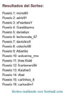 Lista de participantes: wolverine_rms, danieliyo, Garabbanno, Albertito, Kaizher3, daviolico9, xFearlessY, lechoncete_67, fcarbonero94, adris91, colocho08, thee.Kiidd, carlinhos_8, mono80, Abel, carloxdim1.