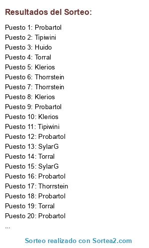 Lista de participantes: Huido, Klerios (3), SylarG (3), Torral (3), Probartol (7), Thorrstein (5), Tipiwini (5).