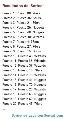 Lista de participantes: Puesto 1: Wizards, Puesto 2: Nuggets, Puesto 3: Nuggets, Puesto 4: 76ers, Puesto 5: 76ers, Puesto 6: Wizards, Puesto 7: Wizards, Puesto 8: Nuggets, Puesto 9: Nuggets, Puesto 10: Nuggets, Puesto 11: Spurs, Puesto 12: 76ers, Puesto 13: Nuggets, Puesto 14: Wizards, Puesto 15: Spurs, Puesto 16: 76ers, Puesto 17: Wizards, Puesto 18: 76ers, Puesto 19: 76ers, Puesto 20: Wizards, Puesto 21: 76ers, Puesto 22: Nuggets, Puesto 23: Spurs, Puesto 24: Wizards, Puesto 25: Nuggets, Puesto 26: Spurs, Puesto 27: 76ers, Puesto 28: 76ers, Puesto 29: Spurs, Puesto 30: Wizards, Puesto 31: Spurs, Puesto 32: Spurs, Puesto 33: Wizards, Puesto 34: Wizards, Puesto 35: 76ers, Puesto 36: Spurs, Puesto 37: Wizards, Puesto 38: Wizards, Puesto 39: 76ers, Puesto 40: Nuggets, Puesto 41: Nuggets, Puesto 42: Nuggets, Puesto 43: Wizards, Puesto 44: Wizards, Puesto 45: 76ers, Puesto 46: Wizards, Puesto 47: Nuggets, Puesto 48: Spurs, Puesto 49: Spurs, Puesto 50: Wizards, Puesto 51: Spurs, Puesto 52: Spurs, Puesto 53: 76ers, Puesto 54: Spurs, Puesto 55: Nuggets, Puesto 56: Nuggets, Puesto 57: Nuggets, Puesto 58: Wizards, Puesto 59: 76ers, Puesto 60: Nuggets, Puesto 61: 76ers, Puesto 62: Wizards, Puesto 63: Nuggets, Puesto 64: Wizards, Puesto 65: Nuggets, Puesto 66: Wizards, Puesto 67: Wizards, Puesto 68: Wizards, Puesto 69: Wizards, Puesto 70: Nuggets, Puesto 71: 76ers, Puesto 72: Nuggets, Puesto 73: Spurs, Puesto 74: Nuggets, Puesto 75: Spurs, Puesto 76: 76ers, Puesto 77: 76ers, Puesto 78: Wizards, Puesto 79: Wizards, Puesto 80: 76ers, Puesto 81: Nuggets, Puesto 82: 76ers.