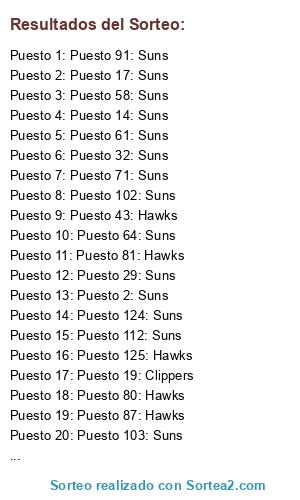 Lista de participantes: Puesto 1: Suns, Puesto 2: Suns, Puesto 3: Suns, Puesto 4: Suns, Puesto 5: Hawks, Puesto 6: Clippers, Puesto 7: Suns, Puesto 8: Clippers, Puesto 9: Suns, Puesto 10: Hawks, Puesto 11: Suns, Puesto 12: Suns, Puesto 13: Suns, Puesto 14: Suns, Puesto 15: Suns, Puesto 16: Clippers, Puesto 17: Suns, Puesto 18: Suns, Puesto 19: Clippers, Puesto 20: Suns, Puesto 21: Suns, Puesto 22: Suns, Puesto 23: Suns, Puesto 24: Suns, Puesto 25: Hawks, Puesto 26: Suns, Puesto 27: Suns, Puesto 28: Suns, Puesto 29: Suns, Puesto 30: Clippers, Puesto 31: Suns, Puesto 32: Suns, Puesto 33: Clippers, Puesto 34: Suns, Puesto 35: Hawks, Puesto 36: Clippers, Puesto 37: Suns, Puesto 38: Clippers, Puesto 39: Suns, Puesto 40: Clippers, Puesto 41: Clippers, Puesto 42: Suns, Puesto 43: Hawks, Puesto 44: Suns, Puesto 45: Suns, Puesto 46: Suns, Puesto 47: Suns, Puesto 48: Hawks, Puesto 49: Suns, Puesto 50: Clippers, Puesto 51: Suns, Puesto 52: Suns, Puesto 53: Hawks, Puesto 54: Suns, Puesto 55: Suns, Puesto 56: Hawks, Puesto 57: Hawks, Puesto 58: Suns, Puesto 59: Suns, Puesto 60: Clippers, Puesto 61: Suns, Puesto 62: Suns, Puesto 63: Clippers, Puesto 64: Suns, Puesto 65: Suns, Puesto 66: Hawks, Puesto 67: Clippers, Puesto 68: Suns, Puesto 69: Suns, Puesto 70: Suns, Puesto 71: Suns, Puesto 72: Suns, Puesto 73: Suns, Puesto 74: Suns, Puesto 75: Clippers, Puesto 76: Suns, Puesto 77: Hawks, Puesto 78: Hawks, Puesto 79: Suns, Puesto 80: Hawks, Puesto 81: Hawks, Puesto 82: Hawks, Puesto 83: Clippers, Puesto 84: Suns, Puesto 85: Suns, Puesto 86: Clippers, Puesto 87: Hawks, Puesto 88: Hawks, Puesto 89: Suns, Puesto 90: Hawks, Puesto 91: Suns, Puesto 92: Suns, Puesto 93: Clippers, Puesto 94: Suns, Puesto 95: Clippers, Puesto 96: Hawks, Puesto 97: Suns, Puesto 98: Suns, Puesto 99: Suns, Puesto 100: Suns, Puesto 101: Clippers, Puesto 102: Suns, Puesto 103: Suns, Puesto 104: Hawks, Puesto 105: Clippers, Puesto 106: Suns, Puesto 107: Suns, Puesto 108: Clippers, Puesto 109: Clippers, Puesto 110: Suns, Puesto 111: Suns, Puesto 112: Suns, Puesto 113: Suns, Puesto 114: Suns, Puesto 115: Suns, Puesto 116: Clippers, Puesto 117: Clippers, Puesto 118: Suns, Puesto 119: Suns, Puesto 120: Clippers, Puesto 121: Suns, Puesto 122: Suns, Puesto 123: Suns, Puesto 124: Suns, Puesto 125: Hawks, Puesto 126: Hawks, Puesto 127: Suns, Puesto 128: Suns, Puesto 129: Suns, Puesto 130: Clippers, Puesto 131: Clippers, Puesto 132: Suns.