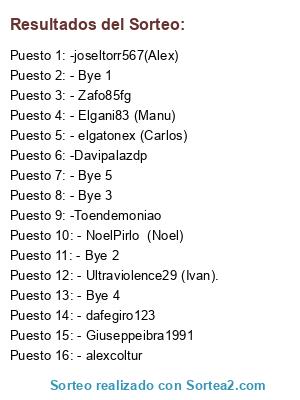 Lista de participantes: - NoelPirlo (Noel), - alexcoltur, -Toendemoniao (Salva), -Davipalazdp, - dafegiro123, - elgatonex (Carlos), - Ultraviolence29 (Ivan), -Zafo85fg, -joseltorr567(Alex), - Giuseppeibra1991, - Elgani83 (Manu), - Alvaro, - FX (José), - By1, - Bye 2, - Bye 3.