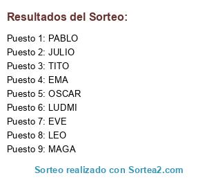 Lista de participantes: EVE, EMA, MAGA, OSCAR, PABLO, TITO, LEO, JULIO, LUDMI.