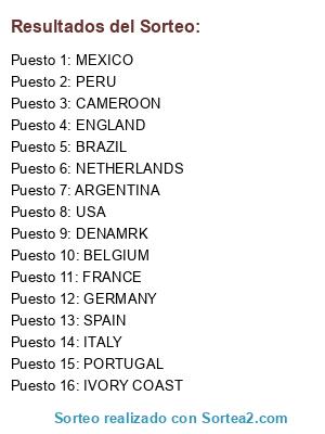 Lista de participantes: FRANCE, BELGIUM, ENGLAND, GERMANY, BRAZIL, SPAIN, PORTUGAL, ARGENTINA, USA, ITALY, NETHERLANDS, CAMEROON, IVORY COAST, MEXICO, PERU, DENAMRK.