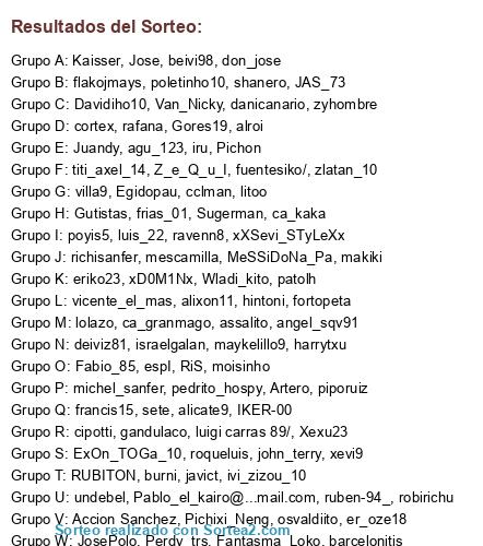 Lista de participantes: zlatan_10, litoo, JosePolo, lolazo, cortex, john_terry, IKER-00, Perdy_trs, maykelillo9, alixon11, xXSevi_STyLeXx, ivi_zizou_10, Wladi_kito, piporuiz, rafana, luigi carras 89/, RiS, xD0M1Nx, MeSSiDoNa_Pa, Z_e_Q_u_I, cipotti, burni, richisanfer, patolh, javict, francis15, er_oze18, Sugerman, angel_sqv91, alroi, Kaisser, roqueluis, luis_22, ravenn8, fortopeta, deiviz81, espI, zyhombre, alicate9, ca_kaka, osvaldiito, beivi98, poyis5, hintoni, israelgalan, ismaeljimva, assalito, pedrito_hospy, sete, poletinho10, moisinho, flakojmays, fuentesiko/, undebel, joan78, Juandy, gandulaco, danicanario, Egidopau, RUBITON, cclman, @Pablo_el_kairo, robirichu, shanero, frias_01, barcelonitis, eriko23, makiki, agu_123, Davidiho10, Gores19, ExOn_TOGa_10, JAS_73, Gutistas, iru, Jose, michel_sanfer, harrytxu, mescamilla, ruben-94_, Xexu23, Pichixi_Neng, vicente_el_mas, titi_axel_14, Accion Sanchez, lucensinho_10, Fabio_85, Van_Nicky, don_jose, Artero, ca_granmago, blackdeevil, Fantasma_Loko, Pichon, xevi9, villa9.