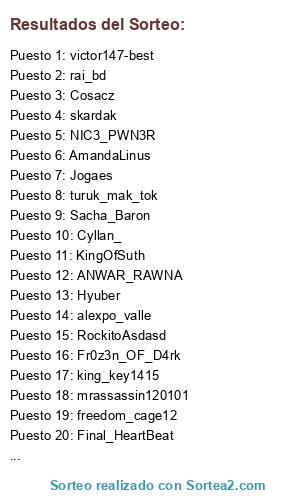 Lista de participantes: Cyllan_, mrassassin120101, Cosacz, Hyuber, NIC3_PWN3R, Jogaes, rai_bd, freedom_cage12, victor147-best, bigsene94, ANWAR_RAWNA, alexpo_valle, skardak, Fr0z3n_OF_D4rk, Final_HeartBeat, Sacha_Baron, RockitoAsdasd, bizio242, AmandaLinus, E001D20803E96, king_key1415, elincreiblejorge, turuk_mak_tok, KingOfSuth.