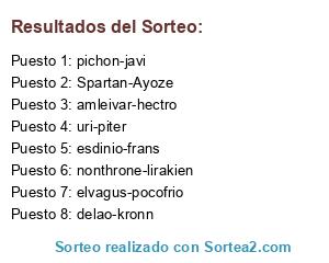 Lista de participantes: delao-kronn, Spartan-Ayoze, elvagus-pocofrio, amleivar-hectro, nonthrone-lirakien, pichon-javi, esdinio-frans, uri-piter.