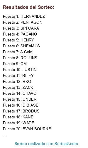 Lista de participantes: A.Cole, AJ, Del rio, RILEY, APOLLO, BIG, WYATT´S, LESNAR, BRODUS, CESARO, CHAVO, KEVIL, CHRISTIAN, CM, CODY, RHODES, BRYAN, OTUNGA, DOLPH, DREW, EL GENERICO, EVAN BOURNE, EZEKIEL, SLATHER, HERNANDEZ, HUSKY, JACK, JEFF, JOHN, MORRISON, JUSTIN, KANE, KARL, KOWENS, KING ANGEL, KOFI, KURT, LUKE, HENRY, MASON, SYDAL, MCGILLIGUTY, MIL MUERTES, PAGANO, PENTAGON, R TRUTH, RKO, REY, RICOCHET, JOE, SANTINO, SETH, ROLLINS, SHEAMUS, SIN CARA, DIBIASE, MIZ, TOMMY, HHH, TYE, TYSON, UNDER, VLADIMIR, WADE, WILLIAM, YOSH, ZACK.