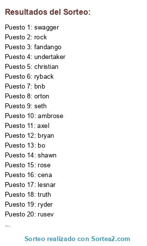 Lista de participantes: rose, bnb, bo, lesnar, jericho, christian, axel, bryan, ambrose, ziggler, edege, fandango, slater, swagger, cena, kane, truth, orton, rock, reigns, rusev, ryback, seth, shawn, sheamus, hhh, undertaker, ryder.
