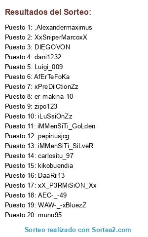 Lista de participantes: xPreDiiCtionZz, iMMenSiTi_SiLveR, AfErTeFoKa, iMMenSiTi_GoLden, pepinusjcg, WAW-_-xBluezZ, xX_P3RMiSiON_Xx, XxSniperMarcoxX, er-makina-10, DaaRii13, dani1232, Luigi_009, .Alexandermaximus, DIEGOVON, iLuSsiOnZz, AEC-_-49, carlositu_97, zipo123, kikobuendia, munu95.