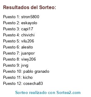 Lista de participantes: juanpor, kicho, viwy206, chivichi, strong5800, vilu206, capi17, eskayolo, cosecha83, alesito, jvvg, pablo granado.