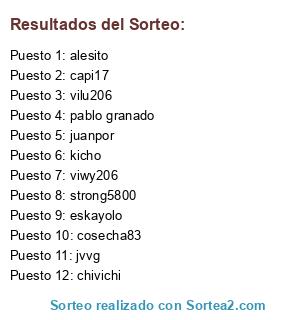 Lista de participantes: chivichi, strong5800, vilu206, capi17, eskayolo, cosecha83, alesito, jvvg, pablo granado, juanpor, kicho, viwy206.