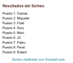 Lista de participantes: JC, Marc, Peret, Fidel, Soro, Palau, Garzas, Robert, Miquelet.