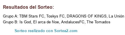 Lista de participantes: La Unión FC, Toskys FC, TBM Stars FC, The Tornados, El arca de Noe, AndalucesFC, DRAGONS OF KINGS, Is God.