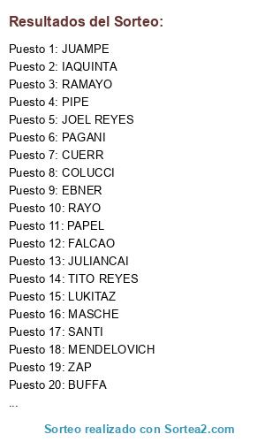 Lista de participantes: COLUCCI, LUKITAZ, SANTI, RAYO, LEA CAH, TITO REYES, PAPEL, EBNER, VAN BOMMEL, CRIXUS, MENDELOVICH, PAGANI, ZAP, MASCHE, IAQUINTA, FALCAO, JULIANCAI, PIPE, BUFFA, JOEL REYES, JUAMPE, FRUTER, RAMAYO, CUERR, PUNCHILLO.