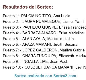 Lista de participantes: - ALAN AYALA, Maricielo Judith, - APAZA MAMANI, Judith Susana, - BARRAZA ALVARO, Erika Madeline, - CHARA TUNQUIPA, Elizabeth Marluve, - COLQUEHUANCA MAMANI, Lev Yohel Sobrayan, - INGALLA LIPE, Jean Paul, - LAURA PUMALEQUE, Lismer Yamil, - LOPEZ CALDERON, Marilyn Gabriela, - PACHECO QUISPE, Brissa Francesca, -PALOMINO TITO, Ana Lucia.