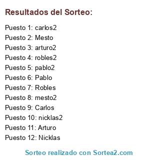 Lista de participantes: Nicklas, Mesto, Arturo, Carlos, Robles, Pablo, nicklas2, mesto2, arturo2, carlos2, robles2, pablo2.