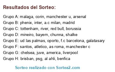Lista de participantes: arsenal, bayern, atletico, oporto, inter, tottenham, a.c milan, as roma, ud las palmas, f.c barcelona, juve, shalke, psg, manchester c, manchester u, madrid, borussia, benfica, malaga, chelsea, liverpool, galatasary, red bull, america, santos, corin, river, brisban, phenix, chunna, al ahli, mineiro.