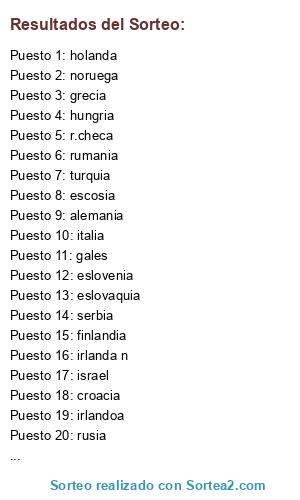 Lista de participantes: austria, belgica, bulgaria, croacia, r.checa, dinamarca, inglaterra, finlandia, francia, alemania, grecia, hungria, irlandoa, israel, italia, holanda, irlanda n, noruega, polonia, portugal, rumania, rusia, escosia, serbia, eslovenia, eslovaquia, españa, suecia, suiza, turquia, ucrania, gales.